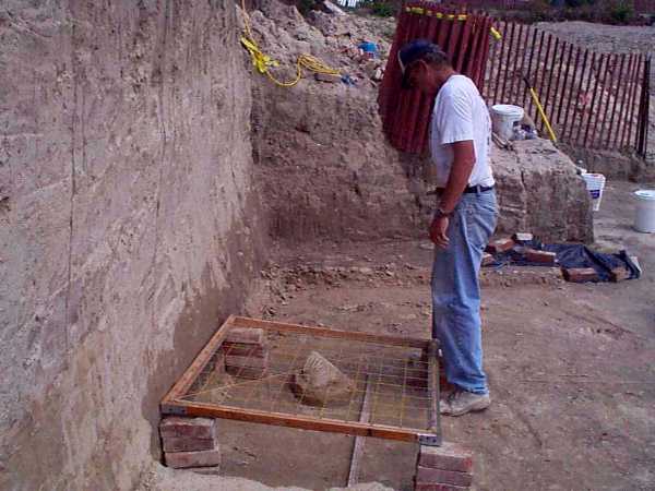 Here, George places the 1 meter square grid over the tooth. This allows the location of the tooth to be transferred from the actual location to the same scale on paper.