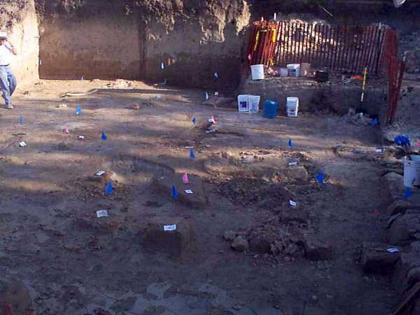This is the beginning of the last day of the excavation. Each blue flag represents the location of all the bones to be surveyed.