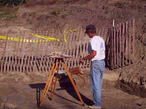 George is busy here setting up the alidade. This was a new instrument to me, and it works all kinds of wonders. Luckily, George assigned me to hold the stadia at each bone location. This is the kind of assignment I can handle--standing in one place and holding a wooden stick.