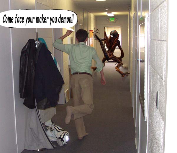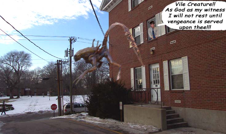 The beast leapt through the 2nd story window to freedom on the outside. Freedom from Josh, but an inevitable battle ground to all those below.