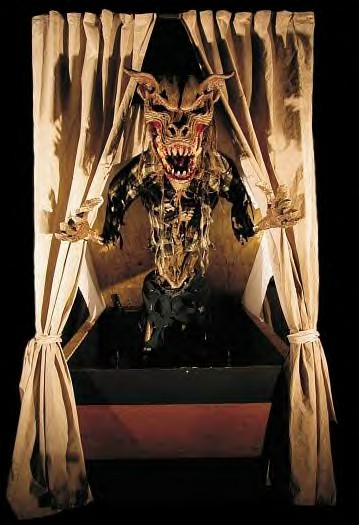 Too late you smell the horrid stench coming from the behind the door. You enter and see a hellish creature emerge from a opera set. Hurry and run!