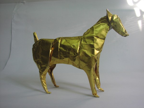 Look, this model is created with the same animal base with a square of foil wrapping paper. I like this model very much. As this year is the year of The Dog, I have placed it on the top of my TV set.