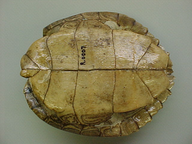 This aquatic turtle reaches 27 cm and occurs mainly in large streams and tributaries of the Mississippi River from Wisconsin through Louisiana and eastern Texas. It has a medial keel with low spines. This specimen died of natural causes in the wild.