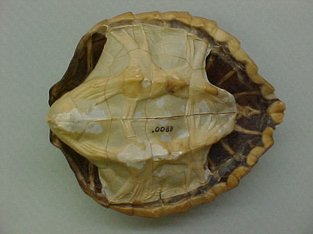 The Hawksbill sea turtle is the only living member of the Eretmochelys genus. The Hawksbill ranges throughout the warm waters of the Pacific, Atlantic and Indian oceans. This shell is from a juvenile specimen and measures only 8.5cm in length. A full grown adult can reach a length of 91cm.