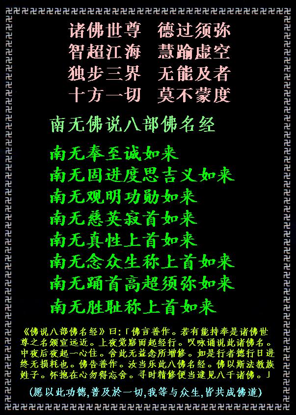 行日进终无损耗也。佛告善作。汝当乐此八佛名经。佛以斯法教族姓子。怀抱
