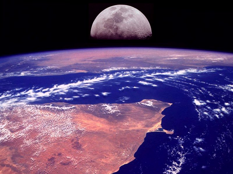 This image is a composite. The space based view of Earth over the African continent is a famous NASA image, and I have added to it my own image of the moon.