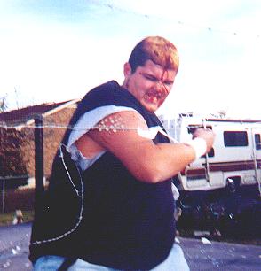 JC after being whipped into the barbwire ropes