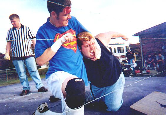 "2 Hardcore being Powerbombed onto a barbwire board(Animated GIF)