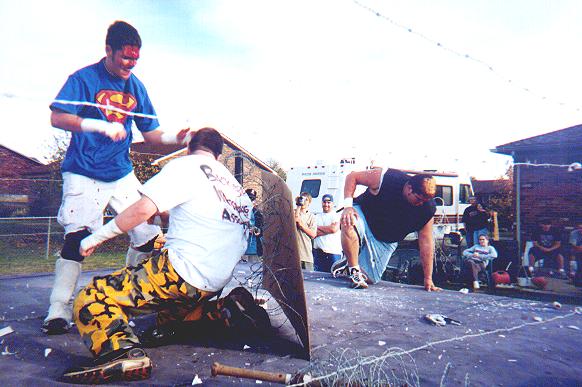 Justin Sane piercing JC's forehead with the barbwire rope
