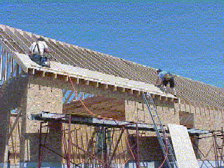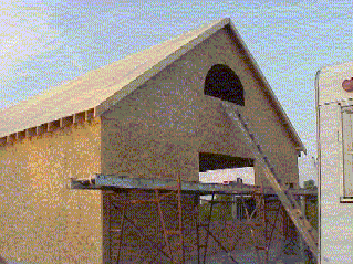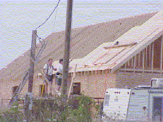 Working alone, John started on sheathing the gable ends. The gable in the front with the circle top window, then the one in the back. Next, more detail work is the order of the day. John made and put up rake boards, fascia boards and "pork chops" to add to the finished look Now we are waiting for the next load of building materials. |