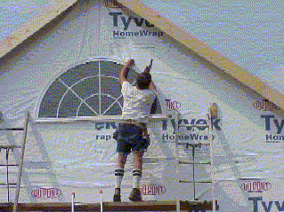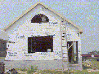 John and Mary Ann worked on wrapping the barn in Tyvek. What a package to wrap! The team worked will together until it was time to do the gable ends. Mary Ann said no way and John did the peaks sole. On the rear gable, John added a bit of himself to the project. He stapled his thumb instead of the Tyvek! He pulled it out with the pliers and Mary Ann poured peroxide over the thumb. Seems to be okay, good thing John is up to date on his tetanus shot. |