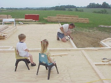 The day started early. John was up and working at 5:45 AM. He reorganized the barn in order to store the shipment of windows that were arriving today. Unfortunately, we will probably not get to install them for quite awhile. He worked on building the double top plates that are placed on the sole plate. Alexandria and Dylan watched for some of the time. All the plates for the first floor have been completed. You can now see the outline of each room including where closets, fireplaces, doors and windows will be.