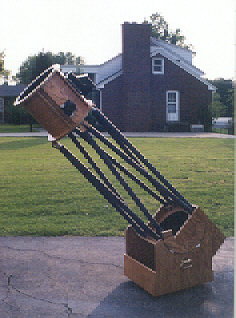 Ariel is, by all means, the prettiest telescope that I have ever built. Believe me, the scanned photo does not do it justice. It is a 12.5" f/6 Dobsonian. The primary mirror was made by Steve Swayze and the quality is perfect. This scope was finished in January 1999, but was sold in April 1999 at the Mid-South Stargaze at French Camp, Mississippi. A professor at Old Miss saw the scope and ended up buying it from me. But, the story doesn't stop there. It seems he had rather it sit in the living room of his restored pre-Civil War home under spot lights. He is a collector of "one-of-a-kind, hand-crafted pieces of art." Oh well, the money funded Vision Quest, so I wasn't too upset that it was sold. |