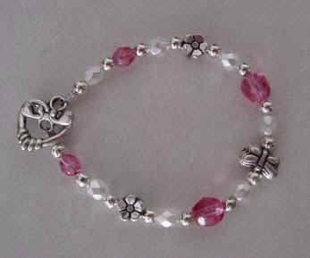 The bracelet measures 5 inches in length and it will fit about a 41/2 inch wrist... Ages 6 - 12 months Made with a heart toggle clasp ,pearls, butterflies and flowers along with glass pink beads! $15.00