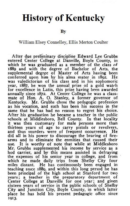 Tragically, Mr. Grubbs was killed in a horrific automobile accident in 1922 not long after his biography appeared in History of Kentucky.