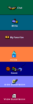 ![]()          Hello and thanks for coming to my website. I just wanted you to know that I am in the process of building my website. So things may be diferent everyday that you come to my website. Also, I wanted you to know that this site will be providing you links to some cool websites and some websites for our school. Please come back and recomend this to your friends. Please if you have a good website send it to me by pressing on the feedback button on the left side of this page. Thanks alot again and hope you find my page interesting. To go to a chatroom of my website go to the left menu side and click on chat!