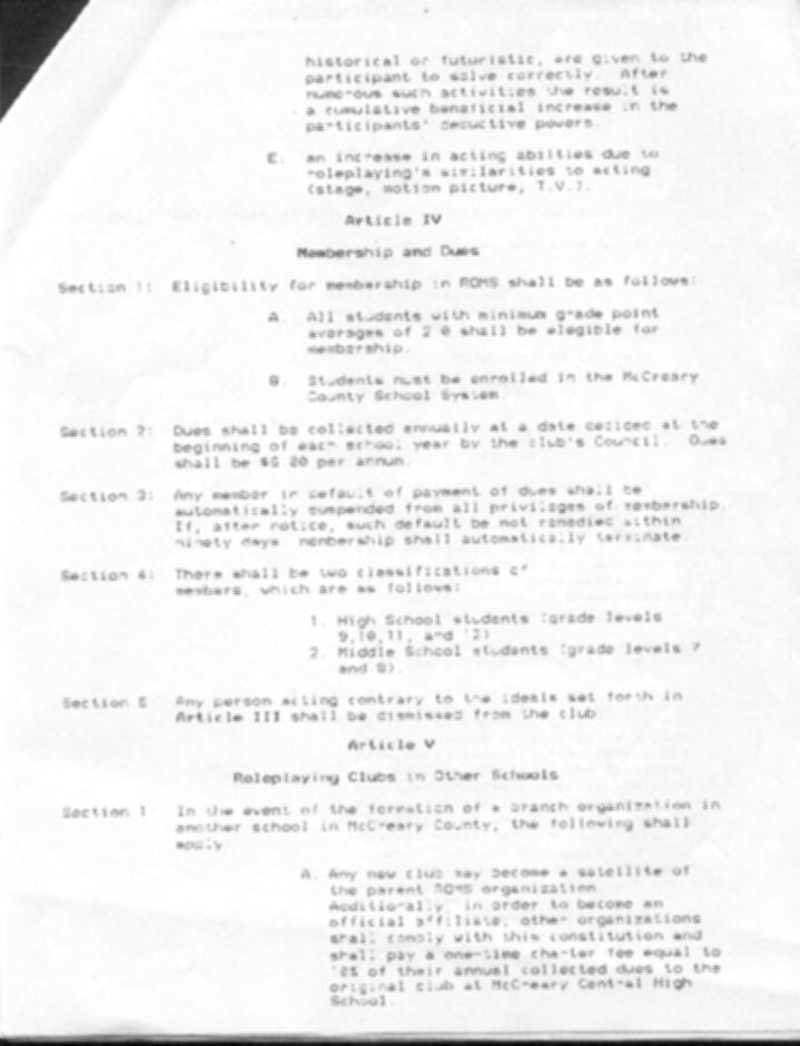 Sadly, though, I started role playing when it wasn't very well received by my community. There was some feeling of a witchhunt, especially for those who played AD&D. I played that some but not nearly as much as Star Wars and Top Secret. We formed this club at the high school to show the community the merits of role-playing. The club is no longer functioning. That's more of a positive sign than anything. However, the consititution will be there for anyone wanting to restart the club in time of trouble.