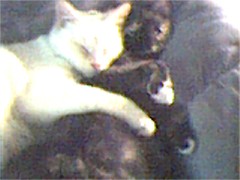 Milo, (the black one) is my constant companion while the kids are in school, she is often in my lap while I work on the computer. Otis, the white one is a big cuddly teddy bear, not the scrawny kitten we got early this year. They are both a testimony for adopting pets. We found Otis at the pound and Milo was a neighborhood stray. I couldn't ask for better kitties!!