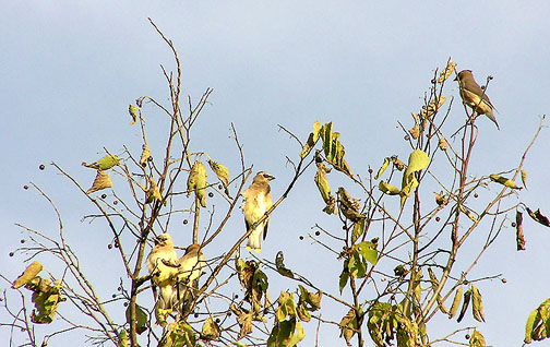 American Robins and Cedar Waxwings in Hackberry Trees