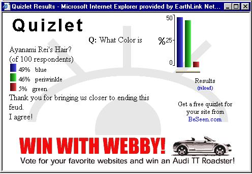 Our first survey was debating the issue of rei ayanami's hair color. The options were blue, periwinkle, and green. The race between blue and periwinkle was hot, but blue pulled in enough votes at the very end. If you don't believe me, here's the screencap!