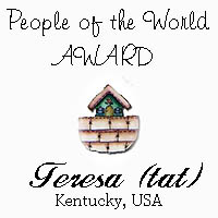 Hello!!!! My name is Teresa, better known as Tat.. I live in Kentucky and have lived here all my life.. I am married to really good guy, we've been married 17 years...Time sure does fly...lol.... We have two children, a boy that is 14 years old and a girl that is 11 years old.. We was blessed to have them.. I have met some really nice people on the internet... I love to play spades, and have some really good friends in there too,, even family...LOL I am so glad you stopped by my home on the net. I will be updating my page often.. So please come back soon and visit me...... |