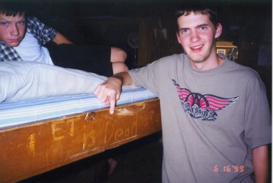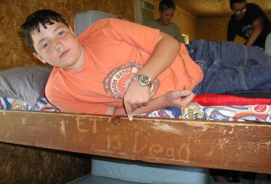 Kyle shows off the "ET is Dead" bunk. One of the bunks in the guy's cabins has "ET is Dead" clearly written on it. So the story goes is that there was a kid who looked alot like ET at camp one year. On the last night of camp, someone wrote "ET is dead" with toothpaste on the side of the bunk. Toothpaste tends to cause a stain if left in a place for too long.