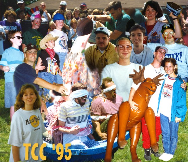 TCC '95June 11-16, 1995Theme: Teach Me, Lord, to Wait Significance: This is MJ's last time to be at TCC. Camp skits were pretty decent this year. Who could forget the Villiage People singing "YMCA?" Tim McHenry and Tim West are slimed.
