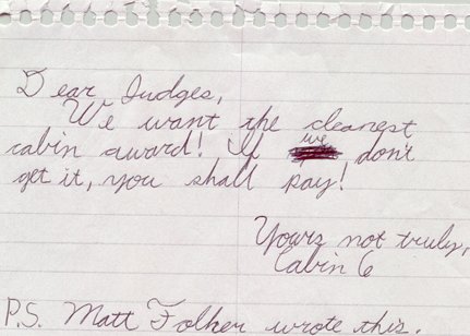 Animation of Tim McHenry and Tim West Getting Slimed Note written to the cabin inspection judges The TCC '95 Page is Sponsored by: Go back to the Main Page.