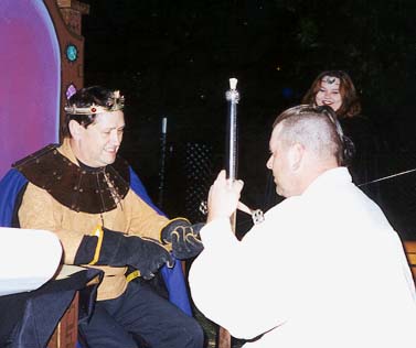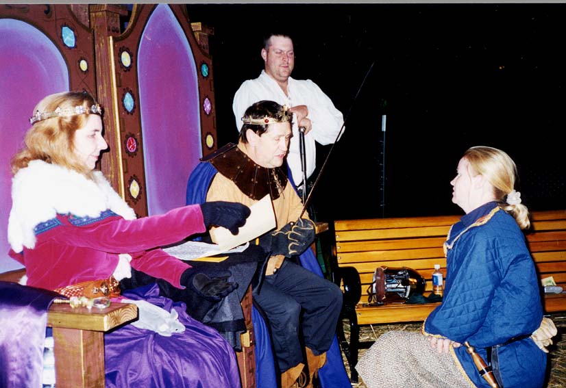 Sir Frodrick kneels before his King as Lady Angel smiles