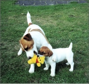 Barney and Sasha playing tugs - May 2001