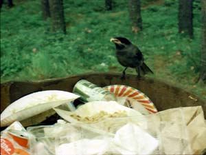 It was still raining in the morning so we set off without breakfast. About two hours later we stopped at a picnic area and made some green scrambled eggs. Campers were flocking all around us so Bill & I made a point of talking about having had the eggs two or three years. One couple came over and advised us not to eat them. After our yummy breakfast we went for a quick swim up to our ankles (hey it was cold). I took a picture of Edward, a semi-tame crow that hung around our garbage pail and took an interest in our eggs. We set off again. By the way, Fred (the invisible penguin) went to Halifax with Roger so our replacement was Edgar, an Italian rattlesnake with some Cree on his mother's side. Edgar quite often gets "rattled" by Bill's driving.