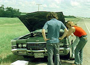 After foolishly trying to follow a CAA city map we came to a CAA building. I went inside and asked if there was an Ontario Motor League garage nearby. The clerk replied, "This is Saskatchewan, but I think I know what you mean." He gave me directions but on the way we discovered a Ford/Mercury dealer so we stopped there instead. The mechanic said he would grease the car as soon as he finished his drink. He was at the table with some other mechanics. After listening to his half hour talk on how he drove his car off cliffs, bridges and through buildings he greased the car and we left. From there we drove several hours and then pulled into a campground for the night. Once again we slept in the car. Bill in the back, me in the front. We insisted Edgar guard Bill's wallet in the glove compartment. He thought we were pulling his leg until we reminded him he didn't have one. I've done a complete turnaround Neil Young rocks. I can't get enough of the Harvest tape. It must be an acquired taste.