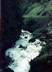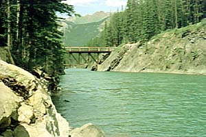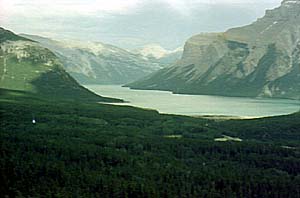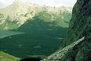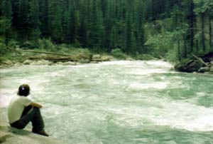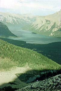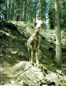 My day off again. Had my usual co-ed shower then went to the Beanery (staff cafeteria), presented my meal ticket and had lunch. I stopped up to see Bill but he was gone. I grabbed my camera and set off to Lake Minewanka taking two girls from Virginia to Cascade Mountain on the way. Half way there I climbed a small cliff to where a baby mountain goat was posing and was able to get within 10' for a picture. At the lake I followed a trail until it ended where a tree had been cut over the path. This usually means to keep off because of bears. I went around it and continued on for about a mile. There were lots of bear tracks. I rested when I came out by a fast river. Had a drink there and played some tunes. I followed it for a further mile - there were trees across the path every 20 feet or so. When I got back to the main trail I joined what I thought was a girl and her little brother out for a walk. When the little boy said, "Mommy, mommy, take me to daddy up ahead", I decided it was time to move on.