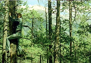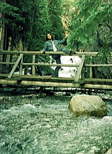 Laundry day. I picked up 3 girls and dropped them at the Banff School of Fine Arts. One of them said she met me last night but I didn't remember her. I did my laundry at "Pinkie's" then picked up a girl from Quebec and drove up to the Hot Springs and went for an hour walk on the trail. At the half way point I set my camera up on a cliff, focused and put the self-timer on. That gave me about 8 seconds to run 15', jump a ditch and climb 20' up a spruce tree. I barely made it. I returned to my room picking my way through the broken beer bottles in the corridor. After work at 11:30pm I dropped over to #216 to see how Bill was doing. He was amusing himself by burping out the door whenever anyone went by.