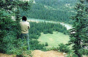 Later that night, three police cars raced down the street and stopped at the tavern and arrested several of our friends for miscellaneous offences. Bill and I decided to sleep in the park as they didn't have a room for us yet at the hotel. Besides we were getting low on funds. Bill was sleeping in the front and I was in the back. About 1:30 a.m. we awoke to a loud rapping on the window. It was an officer of the RCMP who Bill later christened as "Bullshit". Bullshit told us we had to leave immediately and that we could only camp in a campground. What a spoilsport. We left but ignored his advice and slept at a lookout point.