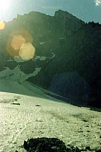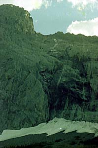 I drove over to Cascade Mountain by about 4:00pm and climbed the two mile trail to the top. It was very steep and had a lake with a stream at the top. I climbed up to the snow line to where a waterfall ran down a cliff. I had to walk on some overhanging snow to get a drink.There was a mountaneer's cap there but no one underneath it as far as I could tell. I slalomed down in my wallabee shoes and had a drink at the bottom. Edgar shed his skin on the way so he could tell his friends he had "scaled" a mountain. I had the equivalent of 15 or so glasses of water and then sloshed back to my car. As usual there were many bear tracks on the way. I met up with the girls I picked up earlier today and they accepted another ride. There were 2 guys in a Pinto next to my car that had the same idea. They were not pleased but they were still nice enough to catch up to me and return my tripod that I left behind. The three of us sat in the front listening to Neil Young Harvest. I dropped them in Banff and went to Moo's for three peanut butter and jelly sandwiches.