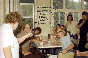 We went to Moo's, played pool, then I went to Stanley's room and stole back the book I lent him. I ran into him later and he called me everything he could think of - apparently he was right at the climax of the book. Bill and I went to the cafeteria for a drink of water. As we were drinking, Helen snuk up behind us and began yelling, "What the @(*#A* do you think you're doing in here at this time?" "Well", lied Bill, "We were working so hard we missed our break so they sent us down now." This calmed her down until we were walking out and I said, "actually we don't even work here anymore." Then we ran for our lives. I pity the poor person who encountered her next.