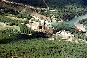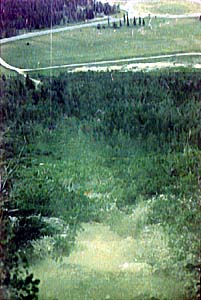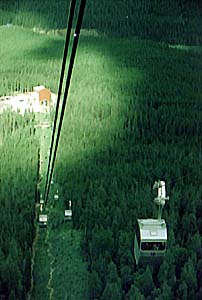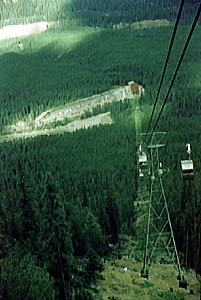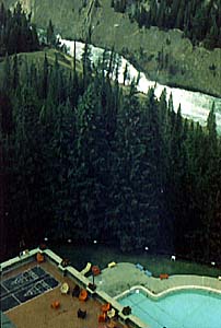 After work, Bill and I went over to the Gondola lift since we had free staff passes. We saw mountain goats and girls so it was worth the trip. Later I drove the car downtown and ran out of gas right in the middle of the two lane bridge. I put on the 4-way flashers and ran to the nearest station. I got a dollars worth of gas in a can which I returned after re-filling my car. With my remaining \\$1.05 I bought some green food colouring. Bill and I planned to drop it in the cafeteria soup pot tomorrow. Back at Bill's room we experimented to make sure that the bottles didn't float. We started to make a tape recording to send back to our parents. We started by taping girls running up and down the hall as we knew our parents would want to here that. Bill was standing near the door when a flurry of girls came around the corner. Strategically, I pushed him out in the hall and locked him out just before yelling at the top of my lungs, "I am a pervert"! When I finally let him back in, he was not amused. I was too weak from laughter to defend myself as Bill threw me over his chair. This was all recorded. We sent the tape off but it was stolen in the mail. Somewhere in here, Bill and I pretended to be guests of the hotel and wandered around inside taking pictures of the pool etc.