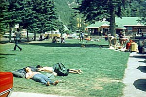 Bill and I went for a walk towards town. Bill had just returned from the Cascade Tavern and was feeling no pain and yelling hello to all the girls. We saw one of our co-workers, Cathy, walk by playing a harmonica. Bill decided to catch up to her so he hid behind trees and shrubs and lamp posts so she wouldn't see him. At least Bill thought he couldn't be seen. We finally caught up to her and compared harmonicas all the way back to the hotel. We also ran into Jim, another dishwasher who was doing his share of staggering. He was from Greece. Simon, yet another dishwasher, was hanging over a railing yelling "this place is full of pregnant women". Back at Moo's we ran into a girl who plans to drive back to Kingston with us when we go.