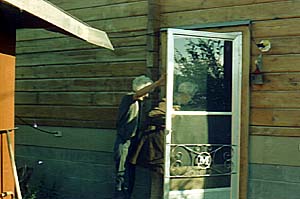 I found out that yesterday at work someone had been pushing a very large cart of dishes when one of the wheels fell off. It was an estimated \\$1000 in broken dishes. Bill was feeling depressed that someone had broken his record. Today I slipped on the floor and demolished \\$36 worth but compared to Bill, I'm just an amateur. However, Ross did spot my event and because of it changed our whole loading system which made it twice as hard and slippery. On my break I ran out to the car and got my camera and raced up to the Beanery. I was just in time to snap a shot of Helen waving her fist at the dishwashing staff. Then she went after me until someone told her I was a reporter with the Calgary Herald. That settled her down into a smiling, hair combing frenzy so I was able to take a few more.