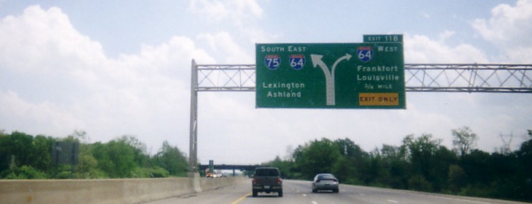 | Overhead diagram sign for upcoming I-64 West interchange (0.75 mile) on I-75 South , Fayette County. The right lane of I-75 South becomes exit only for I-64 West when it gets to the interchange. I-75 South then multiplexes with I-64 East for 7 miles around Lexington. |