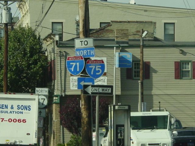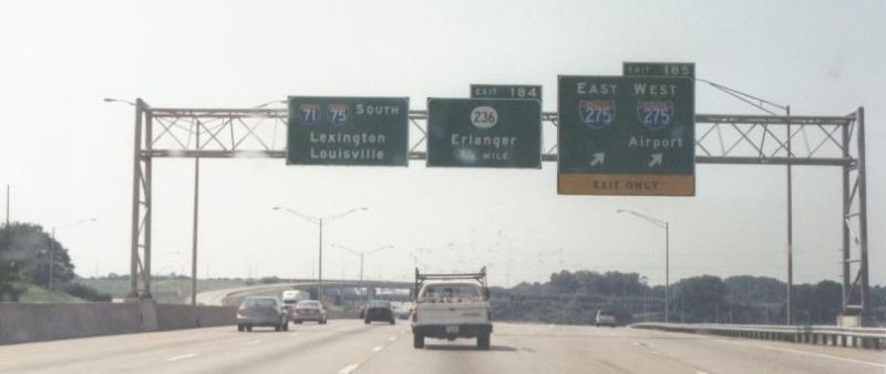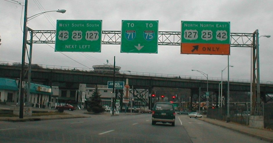 | US 25/US 42/US 127 gantry signage on KY 8 West, Covington, Kenton County. A right turn here puts traffic on the Clay Wade Bailey Bridge, which carries US 25, US 42, and US 127 across the Ohio River. The US 25 designation terminates at the northern end of the bridge, while US 42 and US 127 continue on into downtown Cincinnati and points beyond in Ohio. |