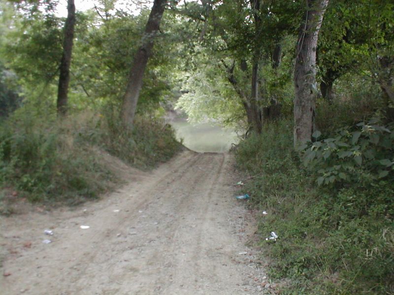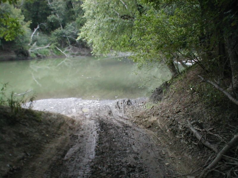 | Gap in KY 57 South at the Licking River, Fleming County. There is no access for KY 57 across the Licking River. Rather than a bridge or a ferry to connect the two segments of highway, on either side KY 57 narrows into a muddy path and then disappears into the river! (For a close-up of the disappearance of KY 57 into the river, please click here.) |