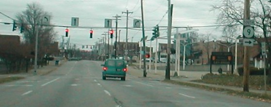 | KY 9 South shield on KY 8 East, Newport, Campbell County. KY 9's intersection with KY 8 in downtown Newport serves as its northern terminus. |