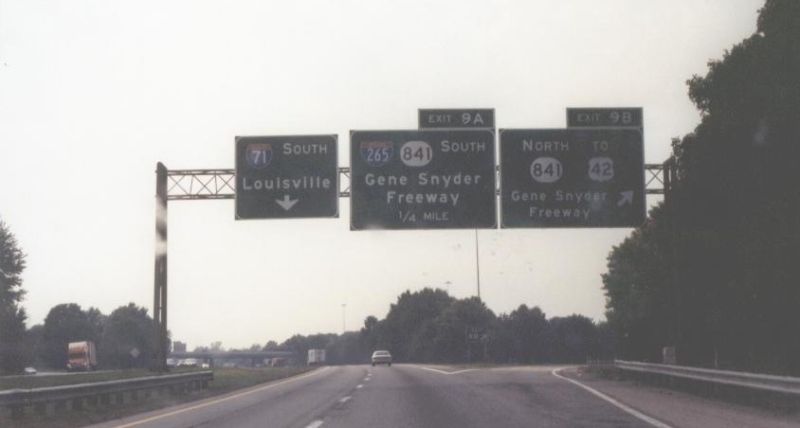 Gantry signage at the start of KY 841 East at the US 31W/US 60 interchange, Jefferson County. This interchange southwest of Louisville marks the transition from KY 1934 (Greenbelt Hwy.) into KY 841 (Gene Snyder Fwy.). 10 miles ahead, KY 841 intersects I-65, where I-265 begins and multiplexes with KY 841 around the eastern edge of the Louisville vicinity up to I-71. |