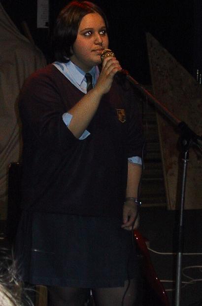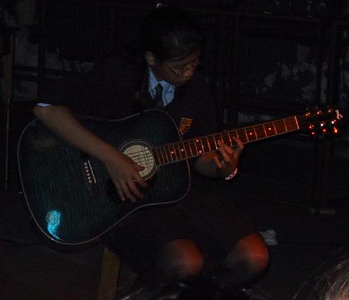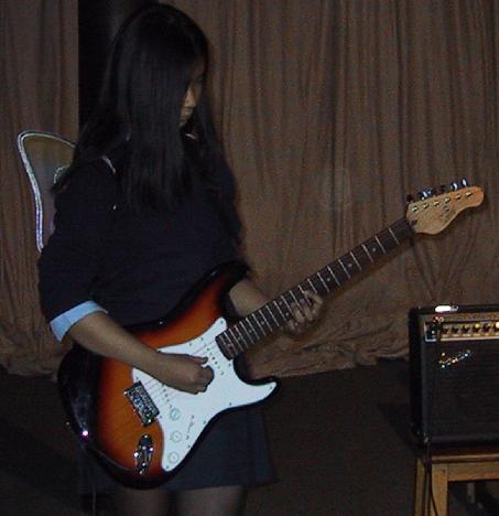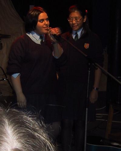 Our First Gig 2002 Our first gig was on a Friday lunchtime at our school. We were the support band for another band, Single Chord. We sang two cover songs - Things I'll Never Say by Avril Lavigne and Radio by Alkaline Trio. Annabel played in both songs, Yasmin sang in both songs and I sang in the first song and played guitar in the second song. It was a wicked time! Here are the pictures that were taken: Annabel on the electric guitar Yasmin and Ky singing Things I'll Never Say Yasmin singing Radio Ky on the acoustic guitar