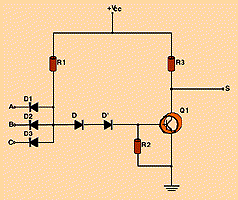 Basta con que una de las entradas esté a nivel bajo para que esto ocurra. Si el resto de las entradas se encontrara a nivel alto, lo único que sucedería es que los diodos correspondientes dejarían de conducir, ya que la tensión de sus ánodos está fijada por el diodo de la entrada que conduce y la tensión de los cátodos sería superior a la de los ánodos quedando polarizados inversamente.