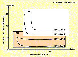 En esta curva comparativa se puede ver la diferencia en los niveles de inmunidad al ruido, entre las puertas DTL y HTL