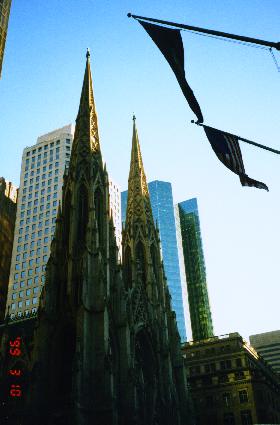 Thursday 990311 We slept late on thursday. When we finally came around we went down to Greenish Village and walked around in the small and sometimes strange shops. We ate at Katzy's, a famous jewish deli. They sent salami to the American soldiers during world war II. We almost had a flat tire when we headed back home. Richard had driven over a huge pothole and probably damaged the tire in the process. Air was leaking out, but it was not a major leak so we managed to get home. That night the Nicks played the Wizards in Madison Square Garden but the tickets were sold out so I missed my first NBA game. I had a discussion with Peter, aunt Carrol's boyfriend, about drinking and driving. Americans do see that differently than us Swedes. They do not think of it the same way we do. I am pretty shocked with the fact that most Americans seem to think it is OK to have a beer or two and then drive. S:t Patrick's Church in the middle of downtown New York. [above right]