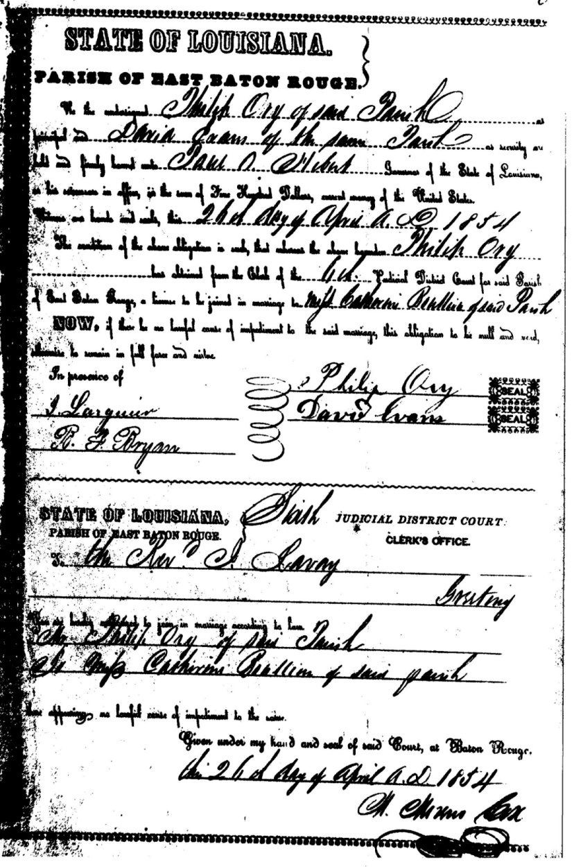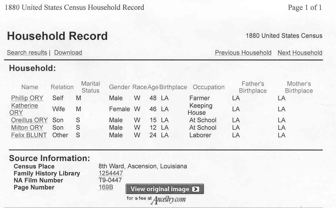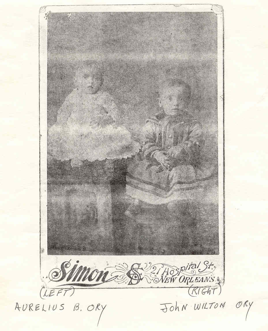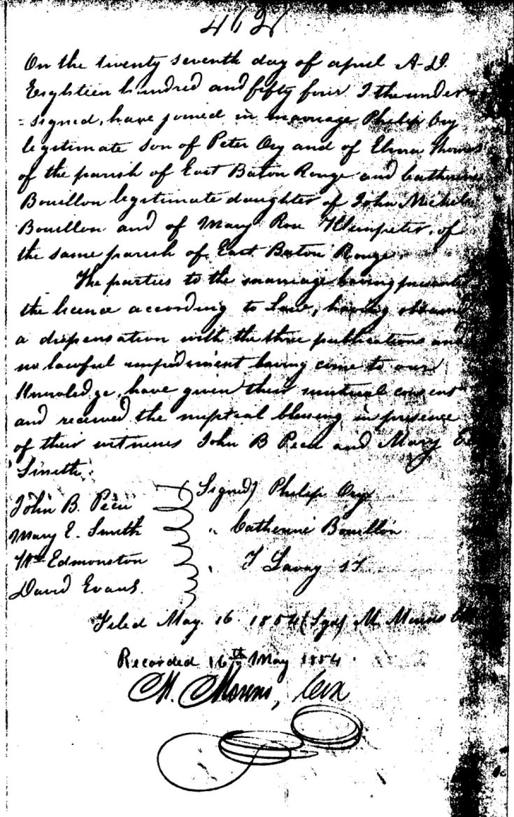 John Phillip ORY was my Great-great-Grandfather. He was born on February 22, 1832 and died on August 02, 1886, the legitimate son of Peter ORY and Elmire THOMAS (according to their marriage certificate). He was married to the former Catherine BOULLION, who was born on July 31, 1833 and died on February 22, 1908, the legitimate daughter of John Michael BOULLION and Mary Rose KLEINPETER. All lived in the Parish of East Baton Rouge and according to their marriage certificate. They were married April 27, 1854 in East Baton Rouge Parish and together they had four children that lived to adulthood (with links)and four children that did not live to adulthood (without links)as follows: